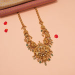 The Silver Long Haaram with Intricate Peacock Design and Lakshmi Devi Highlight is a magnificent expression of traditional temple craftsmanship. Featuring beautifully detailed peacock motifs symbolizing grace and heritage, it is accented with a finely...SKU: CHO26E22750