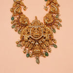 The Silver Long Haaram with Intricate Peacock Design and Lakshmi Devi Highlight is a magnificent expression of traditional temple craftsmanship. Featuring beautifully detailed peacock motifs symbolizing grace and heritage, it is accented with a finely crafted Goddess Lakshmi Devi highlight representing prosperity and blessings. Crafted in a refined silver finish with intricate detailing, this long haaraam is ideal for weddings, festive occasions, and ceremonial wear. It pairs elegantly with silk sarees and traditional attire, creating a regal and timeless statement.