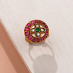 This pink kundan-studded silver ring with floral highlight from Padmam 92.5 fine silver jewellery combines elegance and intricate craftsmanship. Made from 92.5 fine silver, it features sparkling pink kundans accentuating a delicate floral design. Ideal for weddings, festive occasions, or parties, this ring adds grace, sophistication, and a charming touch to any ensemble.