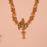 This sacred silver short necklace features intricate detailing of Lord Krishna and a holy cow, symbolizing divine blessings and purity. A meaningful piece that adds spiritual depth to your traditional or festive ensemble.
