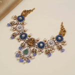 This exquisite silver beaded necklace features a divine Saraswati Devi design, enhanced with radiant kundans and blue sapphires, along with delicate blue gem drops. A perfect fusion of spiritual symbolism and vibrant elegance, ideal for adding a touch of grace to any occasion.