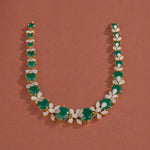 This Silver Stone-Studded Floral Necklace showcases delicate floral designs adorned with shimmering stones and vibrant green stone highlights. Crafted in 92.5 sterling silver, it combines elegance with a pop of color, making it an ideal accessory for festive celebrations or adding a refined touch to everyday outfits.