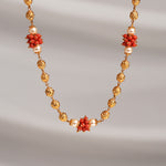 A stunning silver Nakshi mala, intricately handcrafted with traditional motifs and rich detailing. Adorned with lustrous pearls and vibrant coral beads, it exudes timeless elegance and cultural charm. Ideal for festive occasions or as a statement piece, this mala beautifully celebrates heritage artistry.