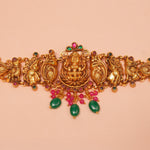 Crafted in 92.5 sterling silver, this Silver Lakshmi Devi Bhaajubandh showcases divine artistry with intricate depictions of Goddess Lakshmi, flanked by powerful lion and elephant manifestations symbolising strength and wisdom. The detailed carvings reflect temple-style grandeur, making it a striking choice for festive and traditional occasions. A perfect blend of spiritual elegance and regal charm for your ethnic ensemble.