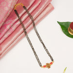 Expertly crafted in 92.5 fine silver, this black bead chain features a divine Radha Krishna pendant adorned with radiant coral stones. Symbolising eternal love and harmony, the intricate detailing brings spiritual beauty to life. The vibrant coral accents add a touch of elegance, making this piece a perfect blend of devotion, tradition, and graceful style for any occasion.