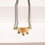 Celebrate divine elegance with this stepped black bead chain, featuring a Radha Krishna pendant accented with emerald highlights. A perfect blend of spiritual grace and timeless tradition.