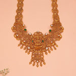 Celebrate divine blessings with this beautifully crafted silver haaram, showcasing detailed images of Goddess Lakshmi and Lord Balaji, embellished with vibrant precious stones. A perfect piece for elevating your spiritual and festive attire.