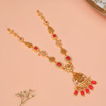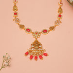 This silver Lakshmi Devi haaram is beautifully crafted with intricate detailing and accented with vibrant coral stones. A divine piece that embodies prosperity and grace, perfect for elevating traditional and festive looks.