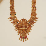 This majestic temple silver haaram features intricate peacock and Lakshmi Devi motifs, showcasing divine craftsmanship and traditional elegance. Accentuated with gold ball-shaped drops, it exudes a regal charm—perfect for grand occasions and cultural celebrations.