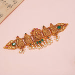 Embrace divine elegance with this Silver Temple Lakshmi Devi Bhaajubandh, crafted in 92.5 sterling silver. Featuring intricate depictions of Goddess Lakshmi, symbolising prosperity, the piece is adorned with delicate pearl hangings and stunning stone work, adding a touch of richness and grace. The traditional temple jewellery style makes it perfect for weddings, poojas, and festive occasions. This Bhaajubandh beautifully combines spirituality, heritage, and timeless craftsmanship for a truly regal finish.