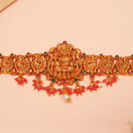 Embrace divine elegance with this Temple Silver Lakshmi Bhaajubandh, crafted in 92.5 sterling silver. Featuring a detailed depiction of Goddess Lakshmi, symbolising prosperity, the baajubandh is beautifully adorned with rubies, emeralds, and coral beads, adding...SKU: CHO26E12592