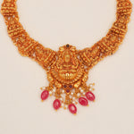 This temple-style silver necklace features a finely detailed Lakshmi Devi pendant, beautifully accented with ruby beads and potas. Crafted in 92.5 silver with an antique finish, it exudes divine charm and traditional elegance. Ideal for festive and bridal occasions, it’s a perfect blend of spirituality and timeless design.