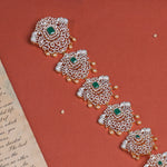 Add a touch of regal charm to your look with this Silver Stone-Studded Jada, featuring delicate pearl hangings. The intricate design and shimmering stones make it a stunning accessory for bridal and festive hairstyles.