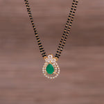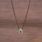 This Black Bead Chain with Drop-Shaped Green Moissanite Stone Pendant from Padmam 92.5 Fine Silver Jewellery exudes elegance and sophistication. Crafted from 92.5 pure silver, the drop-shaped green Moissanite pendant is suspended on a classic black bead chain, offering a vibrant pop of color. Perfect for festive occasions or daily wear, this chain adds a refined and stylish touch to any outfit.