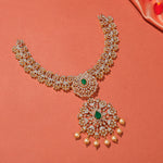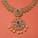 Make an unforgettable impression with this Heavy Silver Necklace, an opulent creation crafted in 92.5 fine silver. The exquisite floral design is adorned with sparkling CZ stones and graceful pearls, bringing together brilliance and elegance in perfect harmony.Every detail reflects masterful craftsmanship and grandeur from the intricate motifs to the lustrous pearl accents. it’s designed for the woman who loves to shine with poise and grace.
