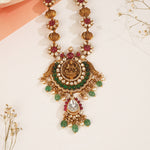 Crafted in 92.5 fine silver, this antique Lakshmi Devi haaram features a beautifully detailed goddess pendant paired with a stunning kundan-studded chain. The intricate design blends traditional spirituality with elegant craftsmanship, making it perfect for festive occasions and religious ceremonies. A timeless statement piece that radiates divine blessings and heritage charm in every detail.