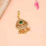 Regal and radiant, this Silver and Kundan Maang Tikka is crafted in 92.5 fine silver and adorned with shimmering Kundan stones. At its centre, a striking green stone adds a bold pop of colour and elegance. Perfect for weddings, festive occasions, and traditional celebrations, this tikka brings together heritage charm and timeless beauty.