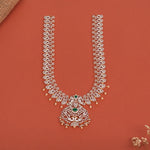This silver long haaram showcases an elegant paisley design, studded with shimmering CZS and adorned with delicately placed emeralds and pearls. A graceful statement piece that beautifully blends tradition with timeless elegance.