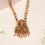 A divine silver haaram featuring a beautifully detailed Lord Ganesh pendant, symbolizing wisdom and remover of obstacles. The necklace is further adorned with manifestations of Goddess Lakshmi Devi, representing prosperity and abundance. A perfect blend of spiritual elegance, this haaram is ideal for auspicious occasions and traditional celebrations.