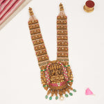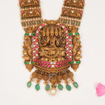 This 92.5 silver Lakshmi Devi Haaram showcases intricate elephant motifs symbolizing strength and wisdom. At its center, Goddess Lakshmi is finely detailed, radiating divine grace. The antique finish and traditional craftsmanship make it a perfect...SKU: CHO26E8286