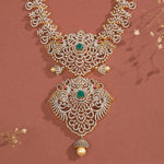 Make a regal statement with this Silver Long Haaram, exquisitely adorned with sparkling CZ stones and elegant pearl hangings. The intricate craftsmanship and graceful design lend it a traditional charm, perfect for weddings, festive occasions,...SKU: CHO26E11078
