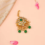 Graceful and traditional, this Silver Maang Tikka is crafted in 92.5 fine silver and adorned with shimmering Kundan stones and delicate pearl hangings. The combination of rich detailing and soft elegance makes it perfect for bridal wear, festivals, and special occasions. A timeless piece that beautifully enhances your ethnic look with charm and sophistication.