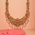 The Traditional Silver Long Haaram with Lakshmi Devi, Peacock, and Elephant Detailing is a magnificent representation of temple-style craftsmanship and heritage elegance. Featuring a finely detailed Goddess Lakshmi Devi motif symbolizing prosperity, it is beautifully...SKU: CHO26H44468