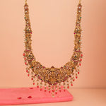 The Traditional Silver Long Haaram with Lakshmi Devi, Peacock, and Elephant Detailing is a magnificent representation of temple-style craftsmanship and heritage elegance. Featuring a finely detailed Goddess Lakshmi Devi motif symbolizing prosperity, it is beautifully complemented by graceful peacock designs and auspicious elephant detailing representing strength and wisdom. Crafted in an antique silver finish with intricate workmanship, this long haaraam is ideal for weddings, festive occasions, and ceremonial wear, pairing perfectly with silk sarees for a regal and timeless traditional look.