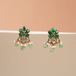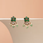 Chic and sophisticated, these silver emerald earrings are beautifully adorned with kundans and delicate pearls. Crafted in 92.5 fine silver, the design blends the rich green of emerald stones with the classic sparkle of kundan work and the elegance of pearls. Perfect for festive wear or evening occasions, they bring effortless grace to any ensemble.