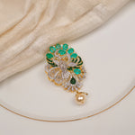 Adorn yourself with this captivating Stone-Studded Silver Bird Pendant, designed to radiate elegance and charm. Featuring a finely detailed bird motif embellished with sparkling stones, it is highlighted by a vivid green Moissanite centerpiece and a delicate pearl drop. The graceful combination of silver, green, and pearl creates a timeless appeal, making it an ideal accessory for festive occasions, special events, or adding a touch of sophistication to everyday looks.