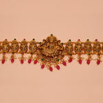 The Elegant Silver Vaddanam with Leaf Design & Red Stone Drops is a graceful blend of nature-inspired beauty and traditional elegance. Crafted in a polished silver finish, it features delicately detailed leaf motifs that add a soft, organic charm to the design. Vibrant red stone drops enhance its appeal with rich color and graceful movement. Perfect for weddings, festive occasions, and bridal wear, this vaddanam pairs beautifully with silk sarees, adding a refined and timeless touch to your traditional ensemble.