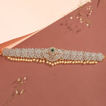 Enhance your traditional ensemble with this elegant Silver Floral Vaddanam, intricately designed with sparkling CZ stones and vibrant emeralds. The delicate floral motifs add a graceful charm, while the combination of silver and green tones brings a fresh, regal touch. Perfect for weddings, festive occasions, or classical performances, this vaddanam beautifully complements sarees and lehengas, adding a refined and timeless finish to your look.
