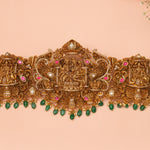 This intricately designed silver vaddanam showcases a divine representation of Hindu goddessess, embodying grace and power. A perfect piece to enhance your bridal or ceremonial attire with spiritual elegance.