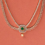 Modern elegance meets timeless charm in this Contemporary Silver Necklace, meticulously crafted in 92.5 fine silver. Sparkling CZ stones bring a refined brilliance, while the green stone highlight adds a vibrant touch of sophistication.Designed for the modern woman who values understated luxury, this necklace seamlessly complements both festive attire and contemporary ensembles. A perfect expression of Padmam’s artistry and elegance, it’s a statement of style that never fade